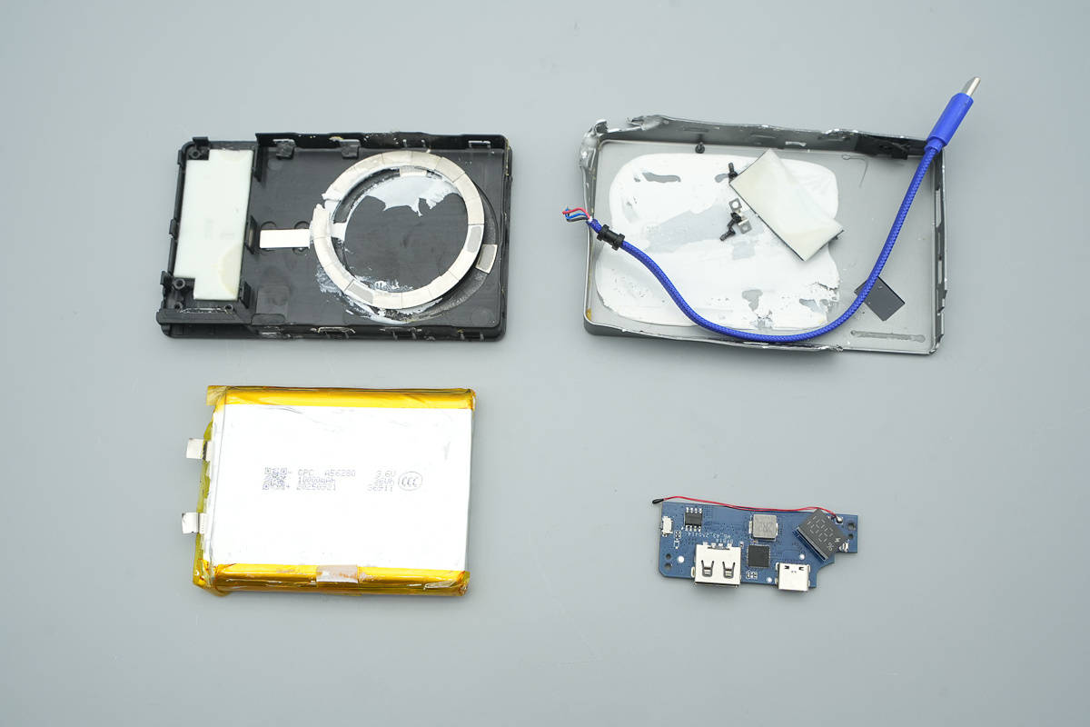 充电头网拆解了解到,该产品内部采用单块10000mAh软包电芯供电,电芯来自GPC格林德,本身通过3C认证。电芯旁加入NTC热敏电阻进行温度检测,主板关键区域覆盖导热贴,并配合导热胶、缓冲泡棉等材料,对散热、防护和结构稳定性都有兼顾。