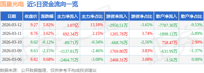 证券之星消息,截至2026年3月12日收盘,国星光电(002449)报收于9.27元,上涨5.82%,换手率14.26%,成交量88.2万手,成交额8.09亿元。