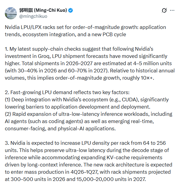 知名苹果供应链分析师郭明錤随即发布供应链调查报告,指出在英伟达入股Groq之后,LPU出货量预测已大幅上调,2026至2027年合计出货量预计达400至500万台,较历史年产量实现约10倍以上的数量级增长。