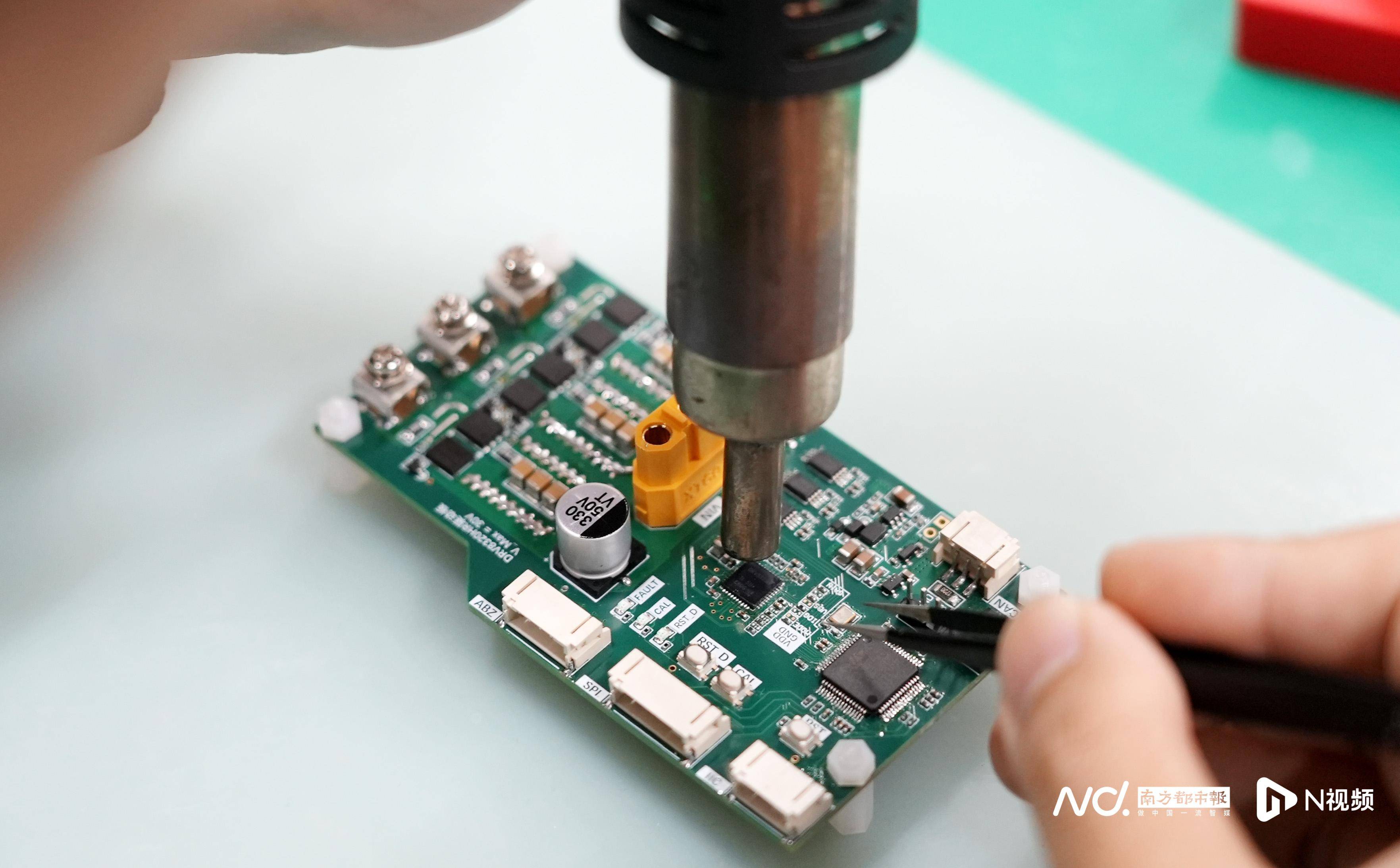焊接台上,绿色的电路板被密密麻麻的电子元器件覆盖,细密的铜线如神经网络般交错延伸。黄健彬右手握着热风枪,左手轻轻用镊子固定一枚指甲盖大小的芯片。随着一缕青烟升起,两秒钟后,芯片被牢固焊接在电路板上。