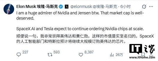 在回复自己的这条贴文时,马斯克称:“顺便说一句,我非常崇拜英伟达和黄仁勋。这样的市值是实至名归的。SpaceX 的人工智能部门和特斯拉预计将继续大规模订购英伟达的芯片。”