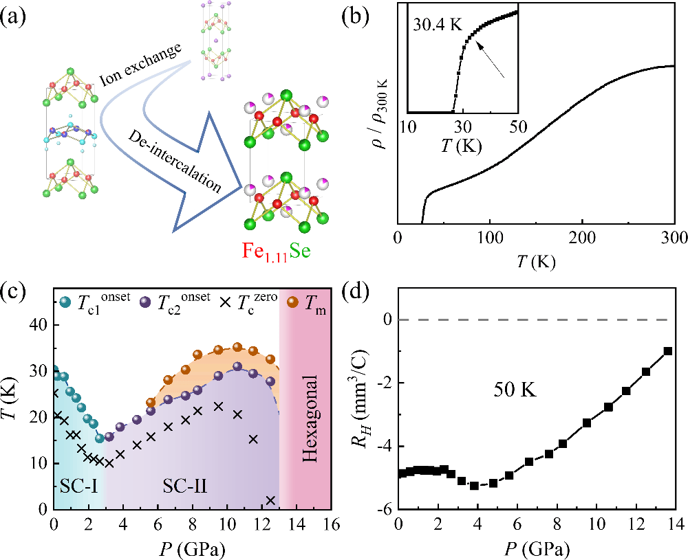 Fe1.11Se的实验合成路线示意图。(b) 常压下电阻率随温度的变化,插图为超导部分的放大,箭头标示了30.4 K的超导起始温度。(c) Fe1.11Se单晶的高压超导相图。(d) 50 K时Fe1.11Se的霍尔系数随压力的变化曲线。