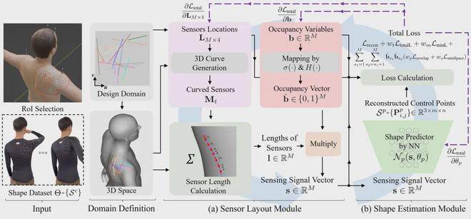 作者先收集机器人或穿戴系统在不同形变下的数据,并把这些形状统一表示成可计算的曲面;然后在这个参数空间里表示每根传感器的位置,并给每根传感器配一个可学习的“开关”,让系统自己决定它该留下还是被删掉;接着,把这些传感器产生的长度信号送进形变预测网络,让网络去重建当前形状;最后,再把预测误差和制造约束一起回传,同时更新网络参数和传感器布局。