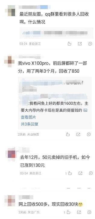 针对这场旧手机回收热潮,社交平台上网友们的反应也各不相同。有网友手机卖早了懊恼不已,也有网友表示现实中并没有网上说的那么夸张。