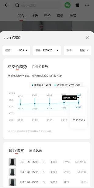 以一台成色95新12G+256的vivo Y200i手机为例,当前的成交价区间已比月初上涨了40元。