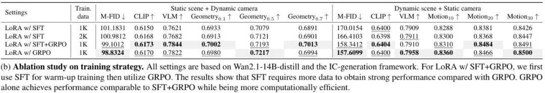 不仅如此,研究团队还要求生成的世界必须一致,这一点光靠模型自身的生成能力还不够,团队进一步引入基于GRPO的强化学习微调策略,提出几何一致性奖励模型(Geometry consistency reward model)和动态一致性奖励模型(Motion consistency reward model),来教会视频模型去生成不同视角下一致性的视频。