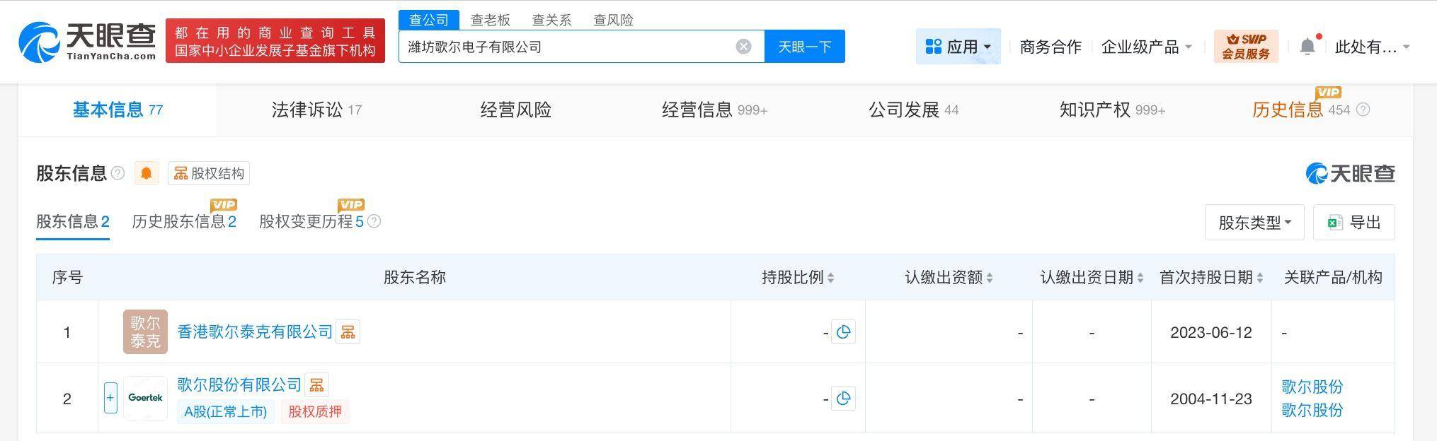 该公司成立于2004年11月,法定代表人为李友波,经营范围包括开发、制造、销售电子产品、通讯产品及配件、音响器材等。股东信息显示,该公司由歌尔股份(002241)、香港歌尔泰克有限公司共同持股。