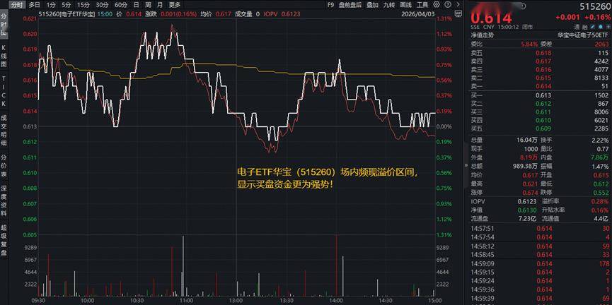 超60亿主力资金涌入电子板块,板块吸金额高居31个申万一级行业第二位,荟聚电子板块核心龙头的电子ETF华宝(515260)场内涨幅盘中逆市上探1.14%,最终收涨0.16%,值得关注的是,该ETF场内频现溢价区间,显示买盘资金更为强势,事实上,该ETF昨天亦单日吸金123万元。
