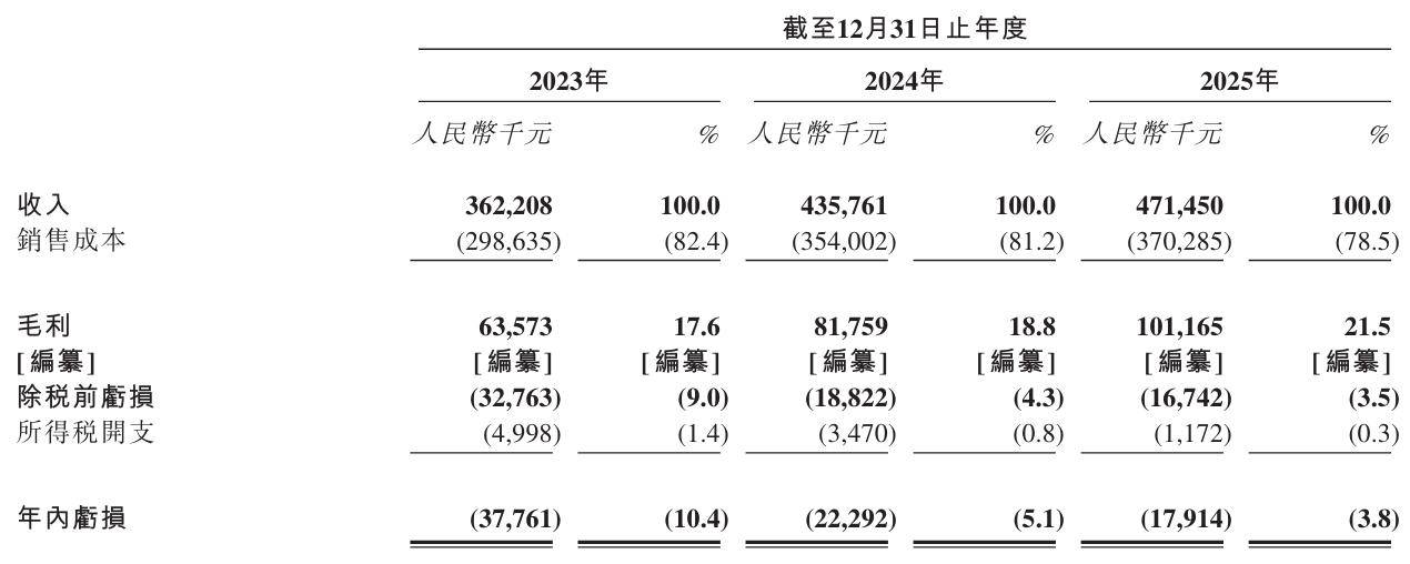 玛冀电子2023年、2024年、2025年年内亏损分别为3776万、2229万、1791万元;年内亏损率分别为10.4%、5.1%、3.8%。