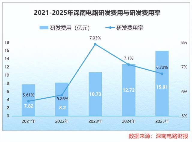 2021年到2025年,深南电路的研发费用从7.82亿元攀升到15.91亿元,翻了一倍多。研发费用率始终保持在5%以上,在制造业里属于较高水平。