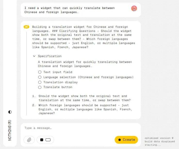 它用起来就和平常跟 AI 聊天没啥区别,比如我说我想做一个翻译小组件,它在稍加思考之后,会进一步问我是想翻译单一语言还是多种语言。