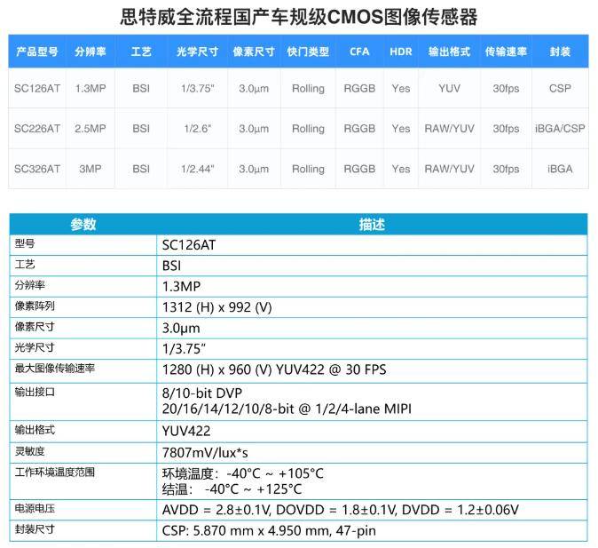 SC126AT 作为思特威全流程国产化高性能车载 CIS 系列的拓展新品,兼顾性能与成本优势,可与已推出的同系列车载 CIS 产品 SC226AT 和 SC326AT,共同组成覆盖车载环视、前视及后视摄像头应用的国产高性能 CIS 影像方案。