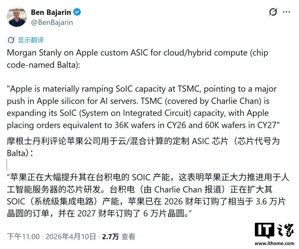 IT之家 4 月 11 日消息,摩根士丹利分析师最新研报指出,苹果公司大幅扩充台积电 SoIC(系统集成芯片)封装产能预订,2026 年预订 3.6 万片晶圆,2027 年增至 6 万片。