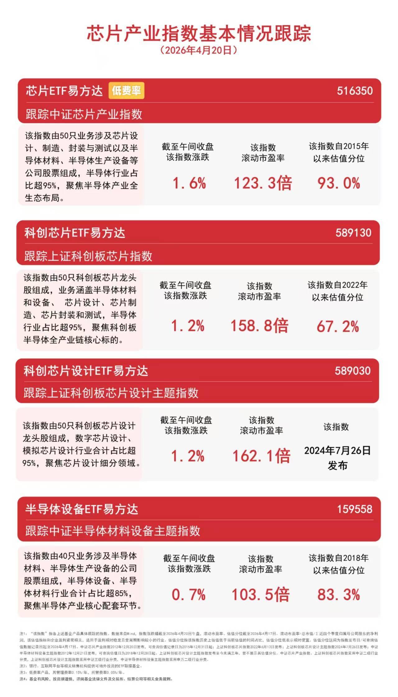 4月20日早盘,存储芯片、AI芯片板块走强,半导体设备板块低开高走,截至午间收盘,中证芯片产业指数上涨1.6%,上证科创板芯片指数、上证科创板芯片设计主题指数均上涨1.2%,中证半导体材料设备主题指数上涨0.7%。