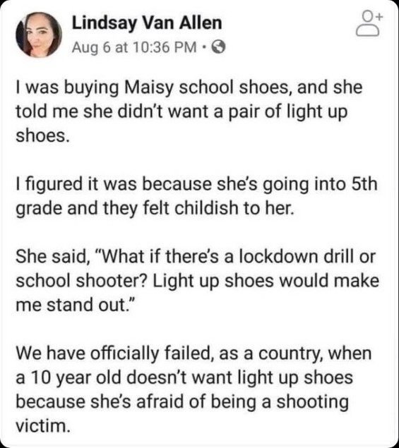 然而,梅茜这样做的真实原因却令人十分痛心。林赛写道:“她说‘如果进行封锁演习或者发生校园枪击事件怎么办?发光的鞋子会让我更引起注意。’”这个孩子非常担心发生校园枪击事件,以致于她不得不放弃每个孩子都想要的LED发光鞋。