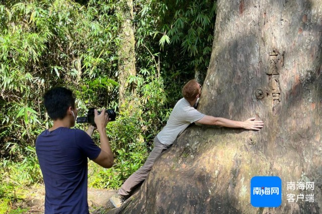 意大利摄影师Fabio用手臂丈量古树。海南国际传播中心供图